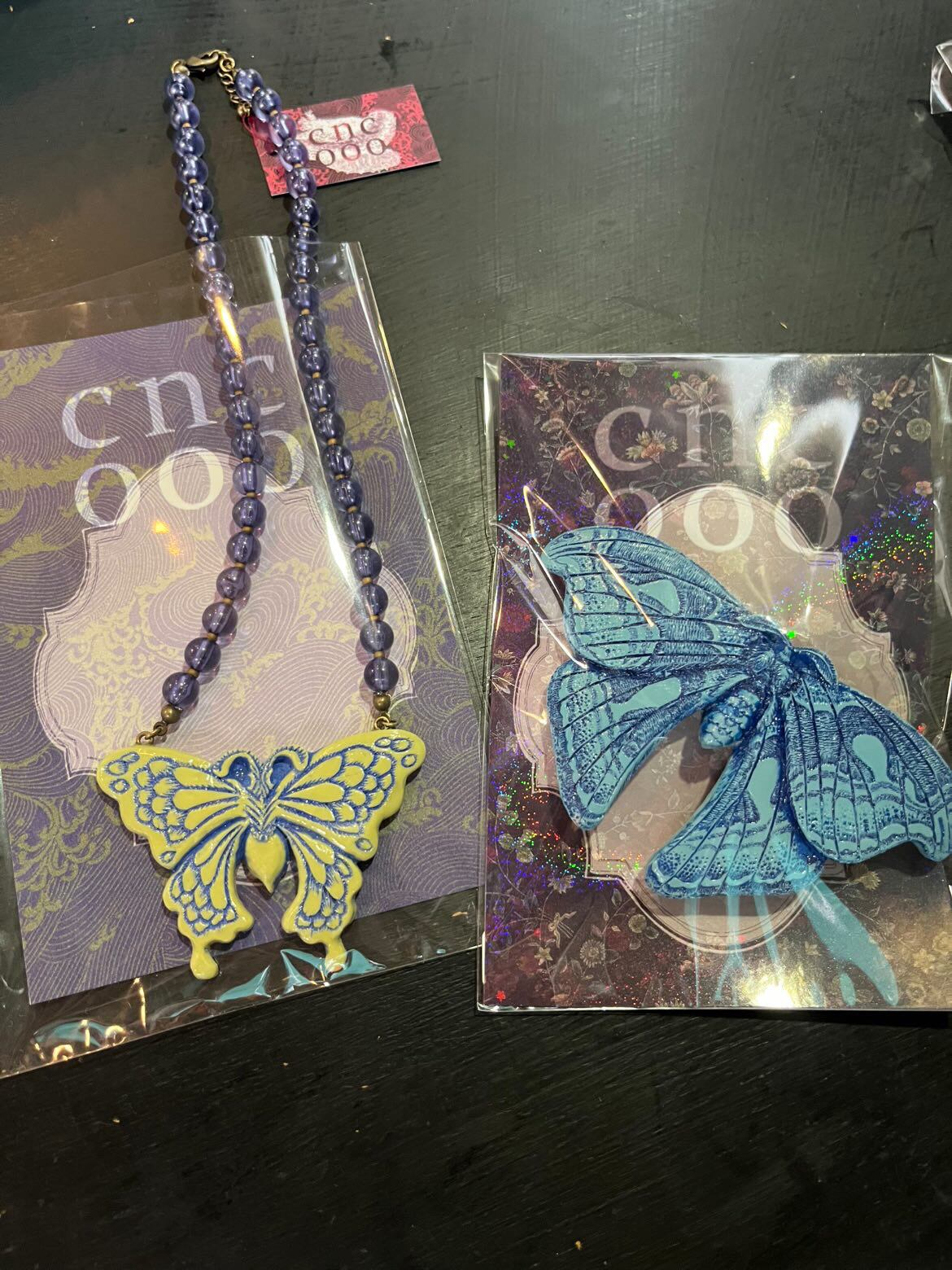 蝶をモチーフにした大き目のビーズと軽量のイヤリングになります。カラーバランスもかわいいです。