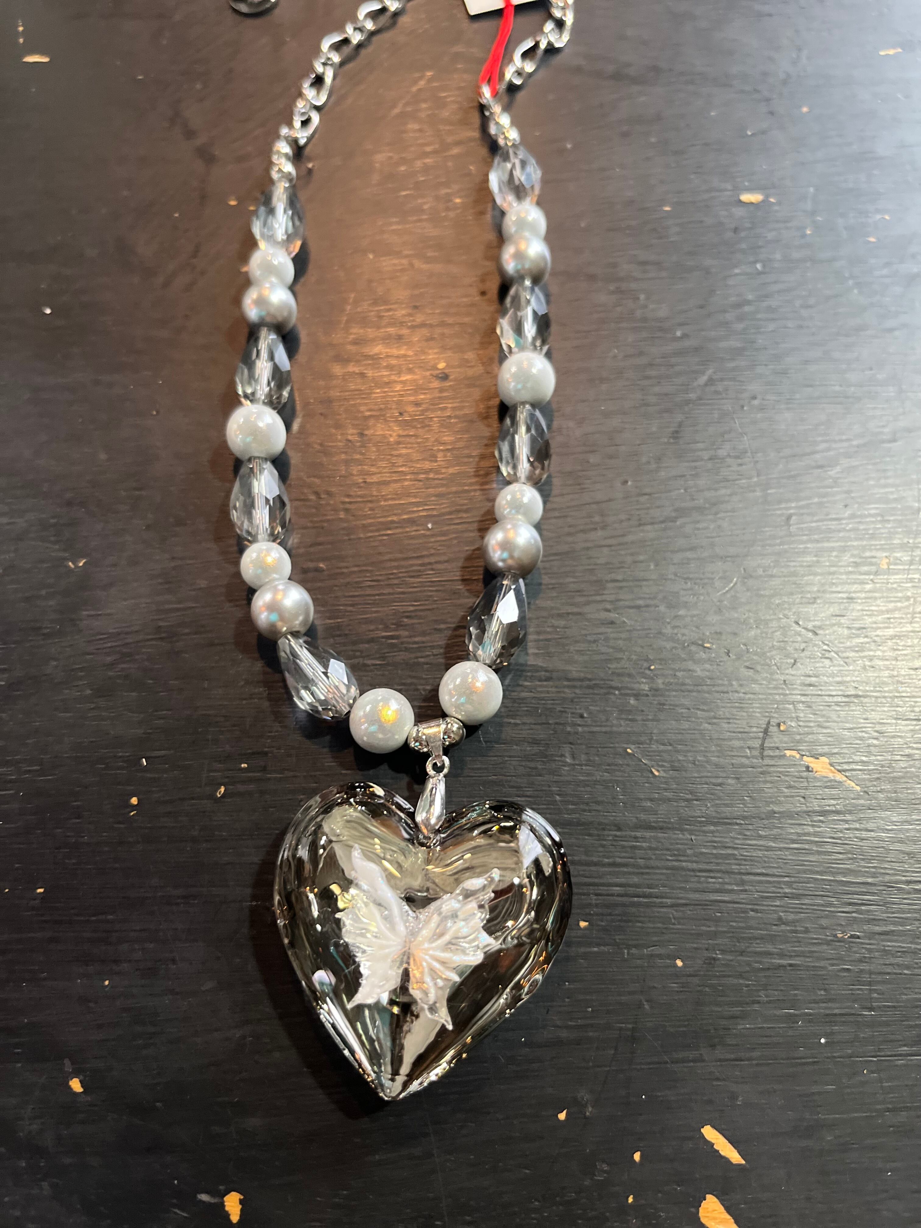 ガラスハートのネックレス、蝶のモチーフが美しく輝きます。季節問わずにファッションに合います