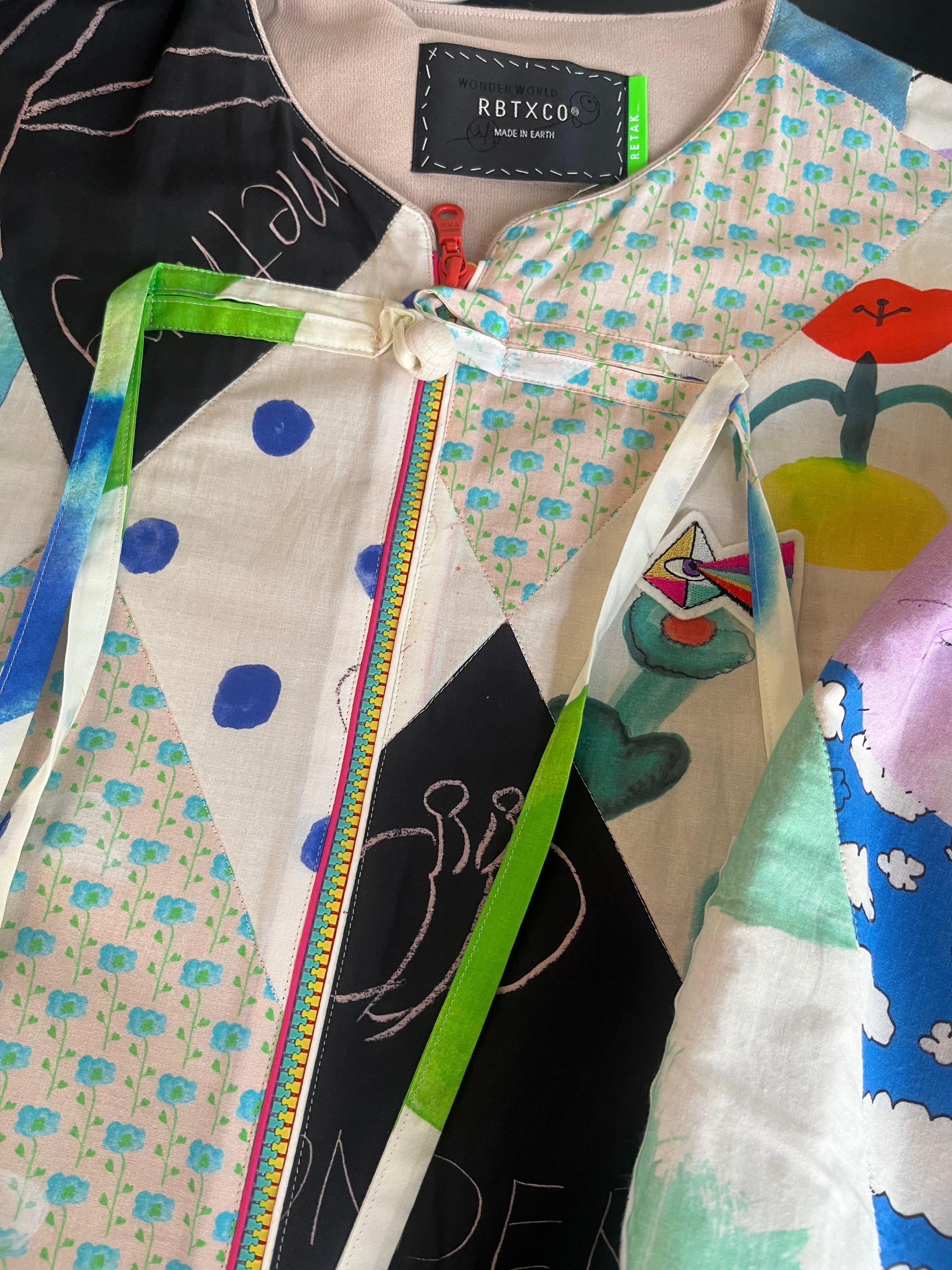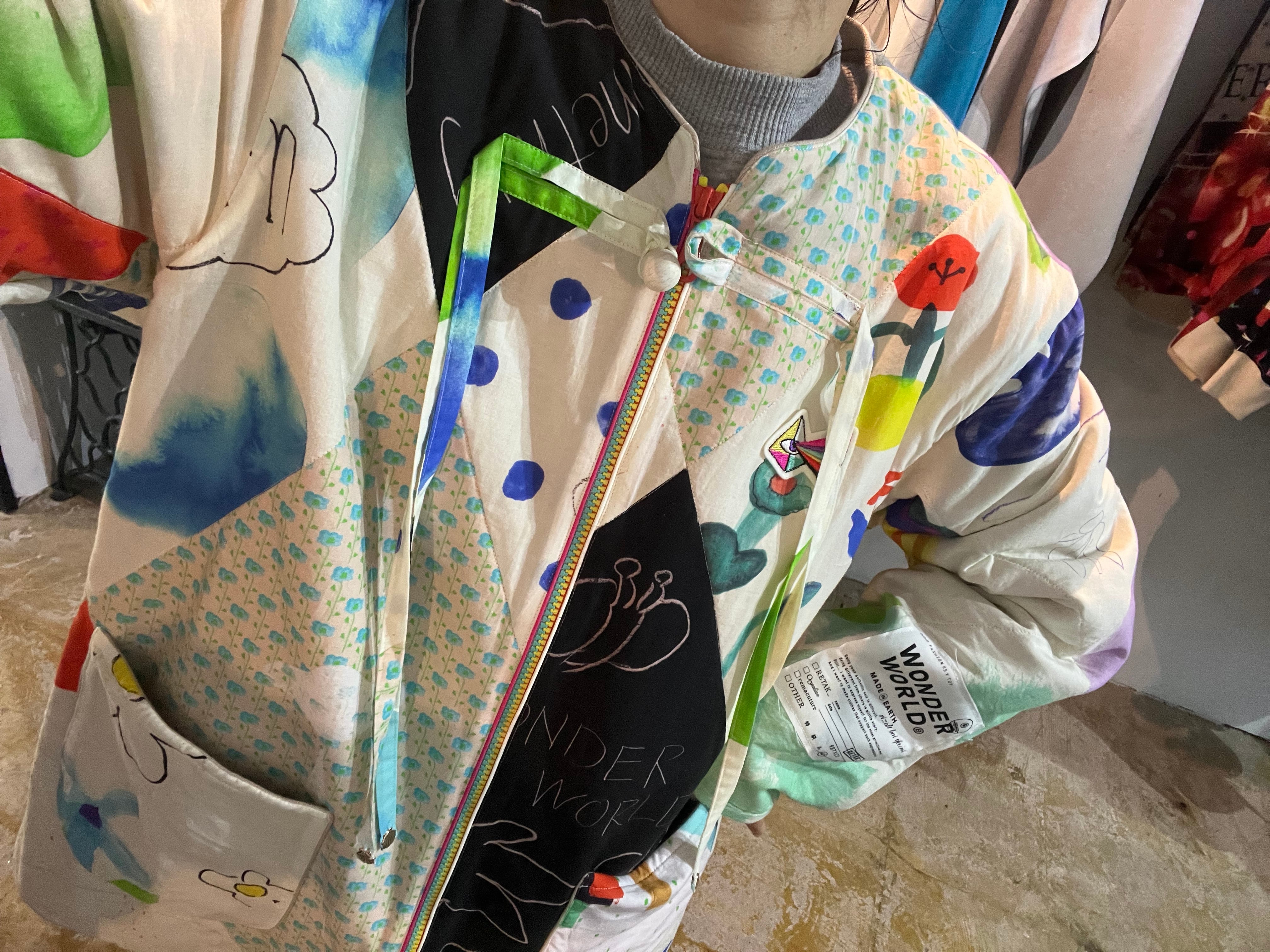 光を放つ時「虹」をテーマに作られた手書きの1点ものです。コットン素材でしっかりした裏地は春、梅雨、秋まで長く使用でき、洗濯もできます。たっぷり着れるサイズ感と柄の派手さの中にも柔らかく映える彩りはどんな日も明るくさせてくれます。木のボタンが可愛い。